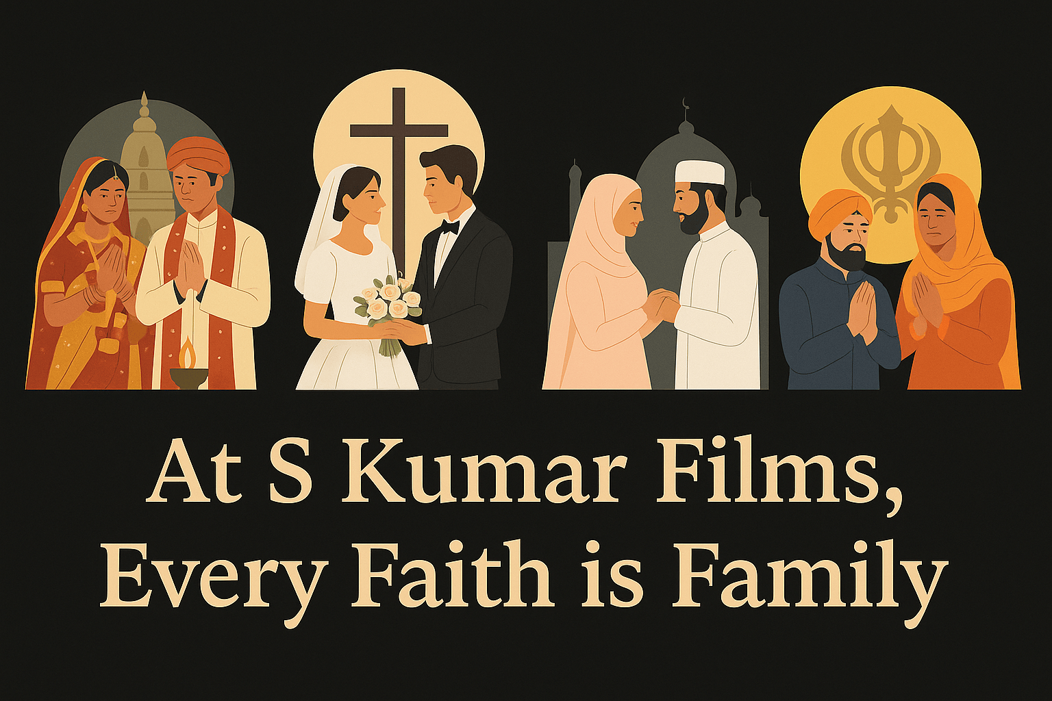 At S Kumar Films, we don’t just capture moments — we honour traditions, emotions, and the values that make every celebration meaningful. Be it a Hindu wedding with sacred mantras, a Christian ceremony with hymns, a Muslim nikah with heartfelt duas, or a Sikh Anand Karaj with divine kirtan — we embrace every faith with love and respect.We believe love has no religion, and emotions need no language. Each story is unique, and every tradition holds beauty. Our team approaches every event with sensitivity and reverence, adapting to your customs with professionalism.We don’t just capture faces — we capture feelings, stories, and memories across all cultures. Because for us, diversity isn’t just accepted — it’s celebrated.At S Kumar Films, we’re storytellers of togetherness. Your love, your faith, your legacy — we’re here to preserve it with joy and honour.